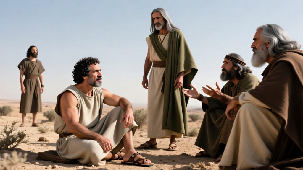 Hiobs Freunde Elifas, Bildad und Zofar glauben, Leid sei eine Strafe Gottes. Hiob widerspricht: Er sei unschuldig. Er ringt mit dem Gedanken, dass auch Gerechte leiden können. Elihu ergänzt, Leid könne auch eine göttliche Erziehung sein.