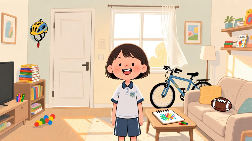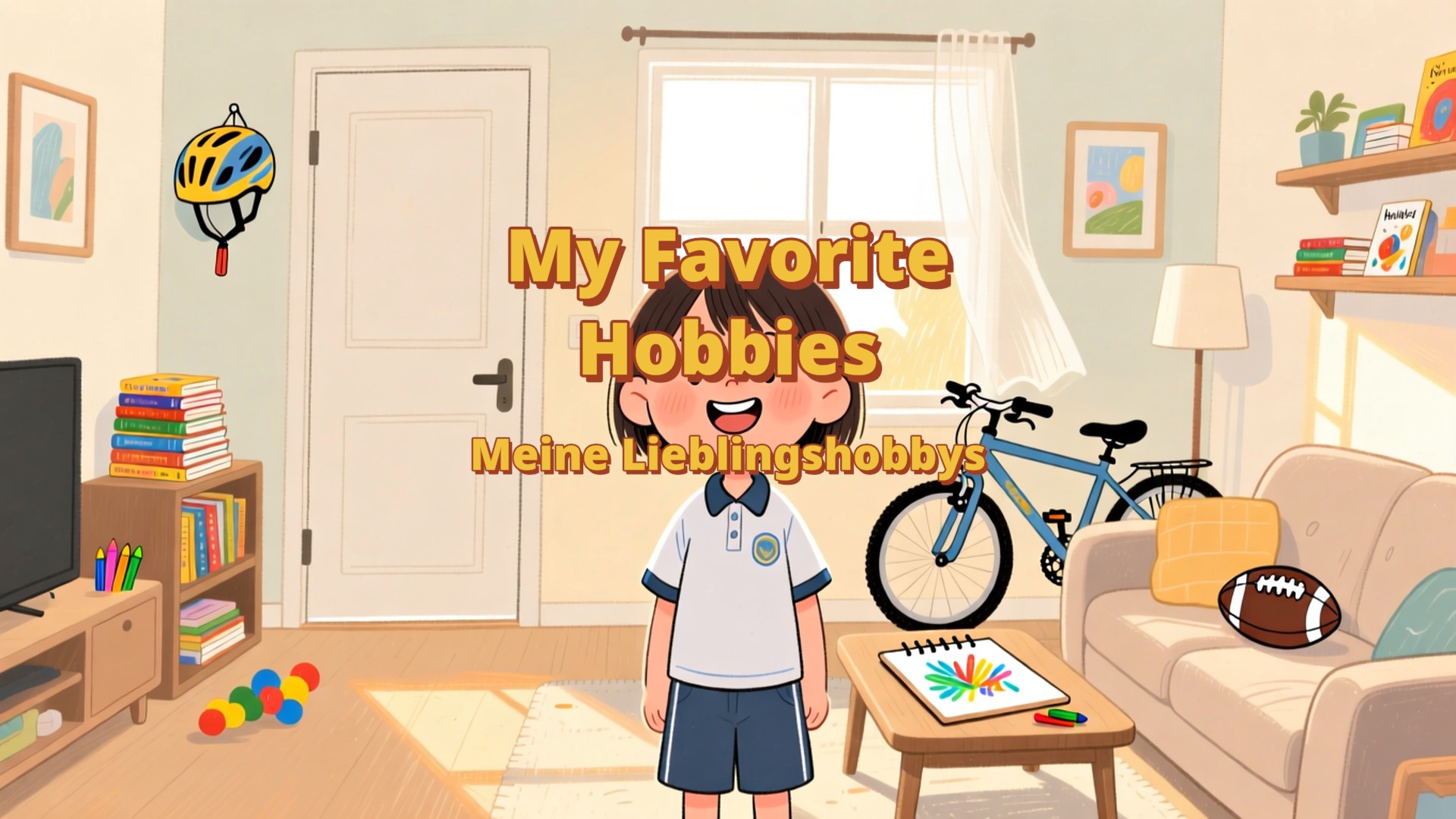 Ein Kind erzählt von seinen Hobbys: Zeichnen, Lesen, Fußball und Fahrradfahren. Mit Familie und Freunden machen diese Aktivitäten Spaß, helfen beim Lernen und sorgen für schöne, entspannte Momente nach der Schule und vor dem Schlafengehen.