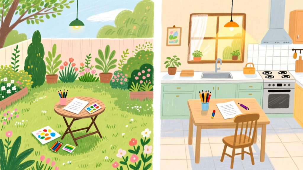 Sometimes we draw in the garden, and sometimes we draw at the kitchen table.