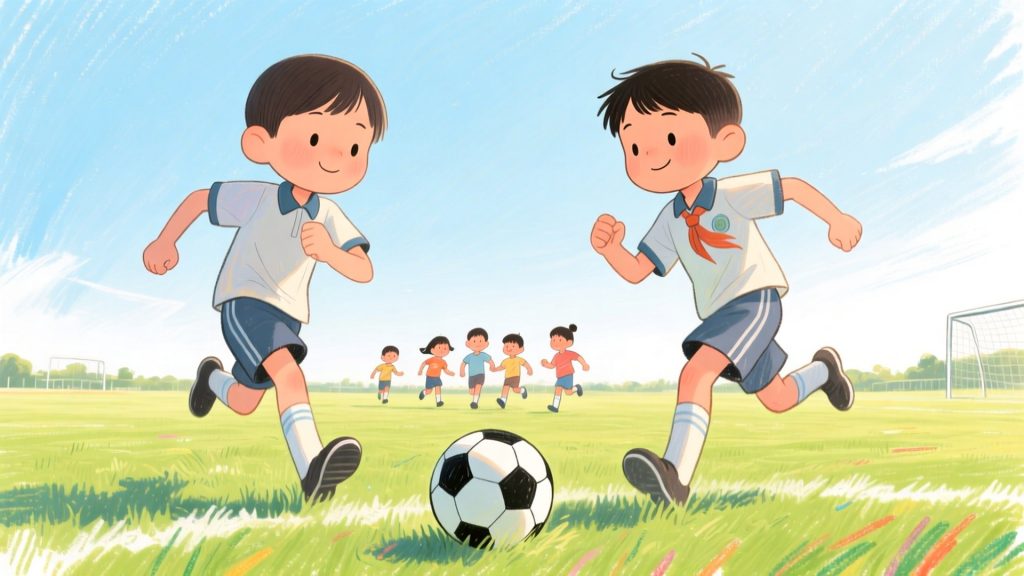 Football is exciting because everyone can join. On sunny days, we play in the park.
